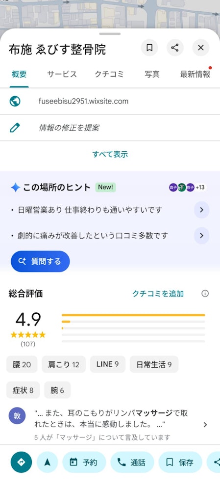 本記事を公開した2日後、整骨院のGoogleマップ上で「この場所のヒント」(AIによるクチコミ要約)が表示されていることを確認しました。