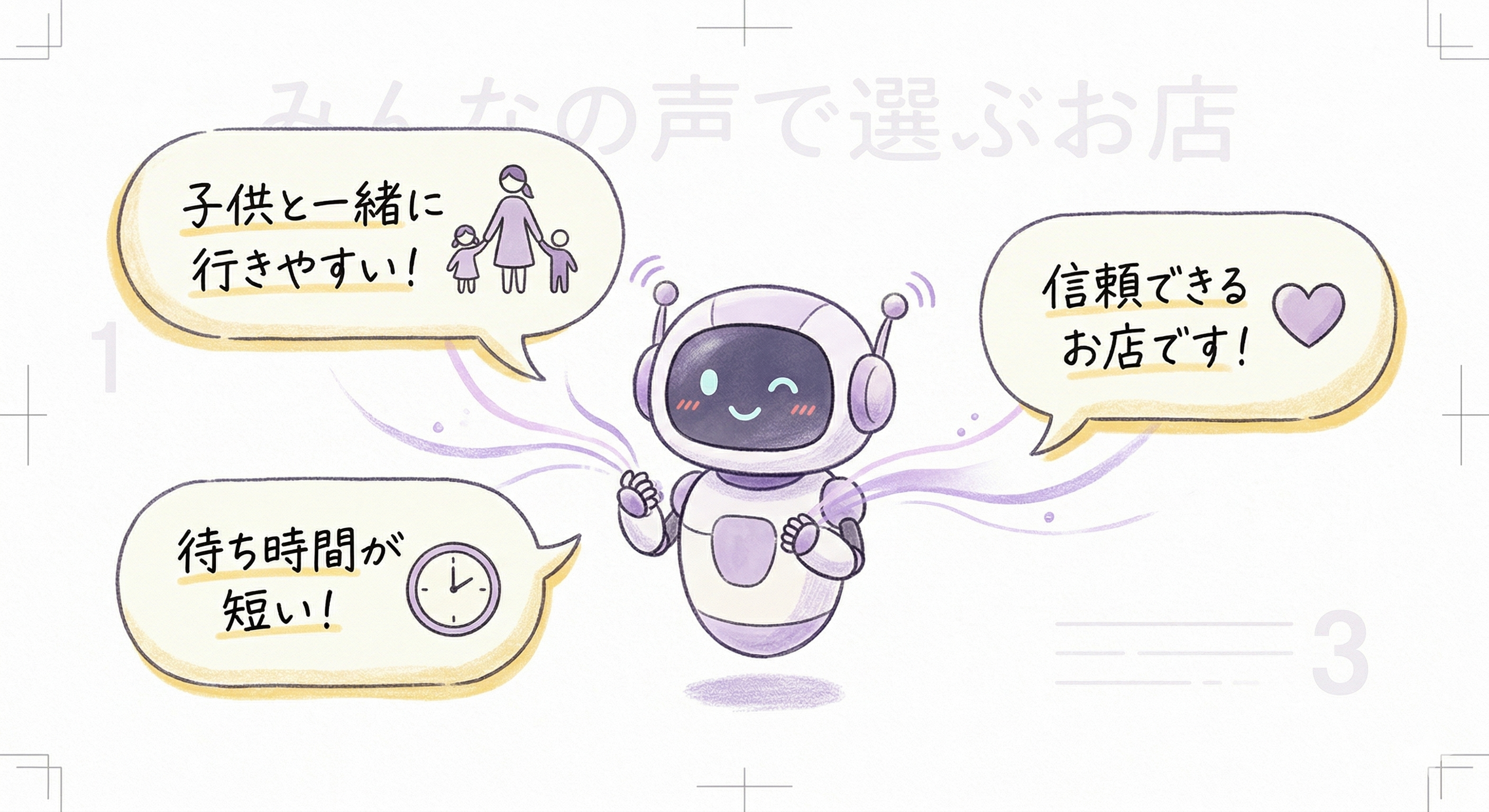 このような具体的な体験の記述を、AIは内容として理解して、検索キーワードと照らし合わせています。お客様が「子連れ 美容室 おすすめ」と検索したとき、AIは「子連れでも安心」と書かれたクチコミを持つお店を回答に取り上げやすくなります。